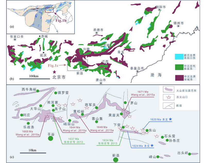 ![]() | 图 1 华北克拉通构造区划简图(a,据Zhao et al., 2005; Santosh,2010)、燕辽裂陷槽中新元古界分布图(b,据黄学光等,2000黄学光,朱士兴,贺玉贞等.2000.承德地区中、上元古界层序地层学研究(科研报告))和平谷-蓟县地区长城系火山岩分布图(c) Fig. 1 NCC Tectonic subdivision(a,after Zhao et al., 2005; Santosh,2010),distribution Mesoproterozoic-Neoproterozoic in Yan-Liao aulacogen(b) and volcanic rock distribution of Changchengian System in Pinggu-Jixian area(c) |