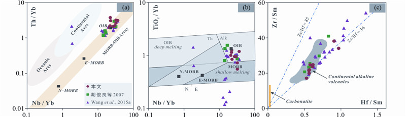 玄武岩的硅饱和程度与熔融深度有关(Depaolo and Ellen Daley,2000),硅不饱和的碱性岩浆产生的压力高于硅饱和的拉斑质玄武岩浆。本文碱性玄武岩和基性岩脉具有与OIB相似的地球化学特征,暗示其地幔源区较深,可能起源于软流圈地幔。REE和HFSE的含量虽然在分离结晶过程中可能会改变,但是具有相同配分系数元素对的比值并不会受到影响,而这些比值只受控于原始岩浆的熔融程度和深度(Pearce,2008),也是判断源区类型是否经历过分离结晶作用的有效标志。本文碱性火山岩高的Zr/Hf值(32~48)与球粒陨石的Zr/Hf值36接近,Hf/Sm-Zr/Sm图解中(图 10c)样品落入大陆碱性玄武岩范围,与碳酸岩范围值相距甚远。结合原始地幔标准化的微量元素配分曲线中Zr和Hf的正异常,可以确定碱性玄武岩的地幔源区没有经历过碳酸岩熔体的交代作用(Dasgupta et al., 2007)。