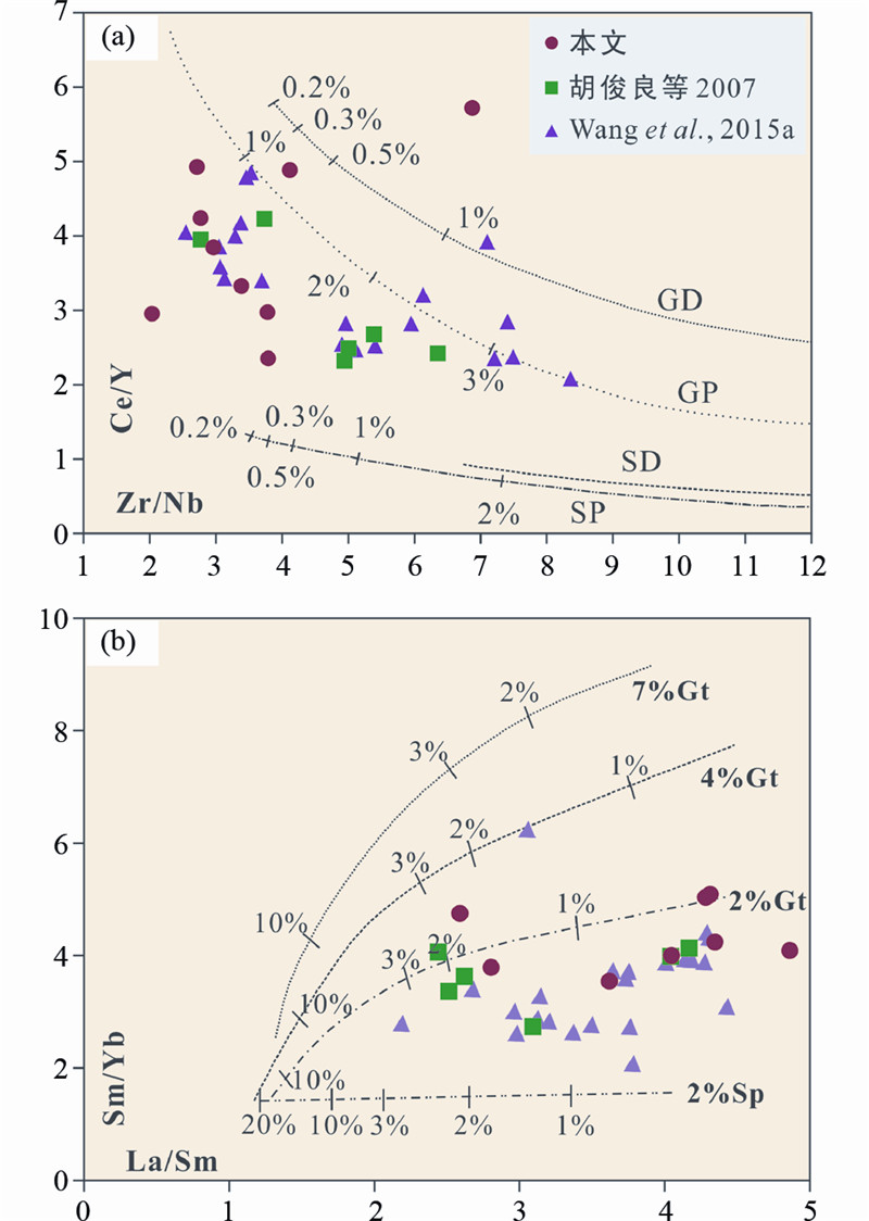 实验岩石学研究表明,轻重稀土强烈分馏的原因可能是源区存在石榴子石的分离结晶作用有关。对于石榴子石来说,Yb是相容元素,而La、Sm是不相容元素,石榴子石相橄榄岩的部分熔融程度越低,对应的La/Yb和Sm/Yb分异作用越明显;在尖晶石相橄榄岩部分熔融作用中,La/Yb变化较小、Sm/Yb基本不变化,因此La/Sm-Sm/Yb图解常用于判别玄武岩的岩浆源区是石榴子石相橄榄岩还是尖晶石相橄榄岩(Xu et al., 2005)。碱性玄武岩的轻重稀土分馏明显,具有显著的右倾型分配模式,在确定地幔熔融程度的La/Sm-Sm/Yb和Zr/Nb-Ce/Y(图 11a,b)分布图中可以看出,该地区的碱性岩落在石榴子石二辉橄榄岩熔融曲线上,推测其熔融程度为2~3%。此外,不相容元素Zr/Y比值受部分熔融程度的影响但不受分离结晶作用的影响(Nicholson and Latin 1992),可以反映熔融过程。熔体中的Zr相对于Y更不相容,熔融程度越低,Zr/Y比值越高。大红峪组碱性玄武岩Zr/Y值(6~9)变化范围不大,说明熔融程度有相似的属性,与图 11a,b模拟计算的结果一致。因此,本文所研究的碱性玄武岩和基性岩脉的源区是石榴石相橄榄岩,而不是尖晶石相橄榄岩。样品的地球化学特征主要受控于地幔源区的组成,也可能与源区经历过石榴石的分离结晶作用有关。