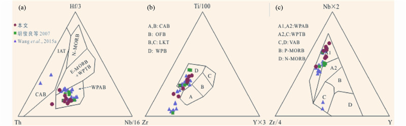 图 12 长城系碱性岩构造判别图解 (a)据Wood,1979;(b)据Meschede,1986;(c)据Pearce and Cann, 1973. CAB(calc-alkali basalt)-钙碱性玄武岩;OFB(ocean floor basalt)-洋底玄武岩;LKT(low-potassium tholeiite)-低钾拉斑玄武岩;WPB(within-plate basalt)-板内玄武岩;WPAB(within-plate alkali basalt)-板内碱性玄武岩;WPTB(within-plate tholeiite basalt)-板内拉斑玄武岩;VAB(volcanic arc basalt)-火山弧玄武岩;N-MORB(normal mid-ocean ridge basalt)-洋中脊玄武岩;P-MORB(plume-influenced MORB)-与地幔柱作用有关的洋脊玄武岩 Fig. 12 Tectonic discrimination diagram of alkali rocks from Changchengian System |