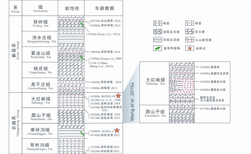 华北克拉通(North China Craton,NCC)地壳具有基底和盖层组成的典型双层结构。早前寒武纪变质基底经历了多期复杂的构造演化,其基底由几个太古宙和古元古代花岗岩-绿岩带及高级区域变质带经吕梁运动(2.0~1.85Ga)拼贴形成的一个规模较大的陆块。尽管在微陆块的划分和拼贴方式上存在分歧,但是在1.85Ga最终拼合被地质学界广泛认可(Zhao et al., 1999,2001,2005,2010,2012;Lu et al., 2002,2004;Guo et al., 2002;陆松年等,2002; Kusky and Li, 2003;Kröner et al., 2005; Santosh et al., 2007,2010,2012,2013;Zhai and Liu, 2003;Zhai et al., 2005,2011)。1.8Ga之后华北克拉通进入相对稳定的沉积盖层形成阶段,与此同时在华北克拉通构造背景由碰撞挤压向拉张伸展转换,燕辽、豫陕和渣尔泰-白云鄂博三大裂谷也逐渐形成,这与全球Columbia超大陆的演化相对应(Condie,2002;Rogers and Santosh, 2002,2003,2009; Zhao et al., 2002,2004;Zhai and Liu, 2003;Wilde and Zhao, 2005;Hou et al., 2006;Ernst et al., 2008;彭澎等,2011)。1.8Ga后华北克拉通之上,发育多期与大陆裂解作用相对应的岩浆事件。具体到燕辽裂陷槽内,目前已确认了一系列代表陆壳减薄和伸展裂解的岩浆事件,包括:1)1.68~1.75Ga斜长岩(anorthosite)、纹长二长岩(mangerite)、紫苏花岗岩(charnockite)、奥长环斑花岗岩(rapakivi granite)(AMCG组合)非造山的岩浆侵入(郁建华等,1996;杨进辉等,2005;Zhang et al., 2007,2012a;高维等,2008;Zhao et al., 2009b;Jiang et al., 2011;Liu et al., 2011);2)1.62~1.68Ga大红峪组钾质火山岩(陆松年和李惠民,1991;陆松年等,2003;Lu et al., 2002,2008;胡俊良等,2007;Wang et al., 2015a);3)1.30~1.33Ga和1.21~1.23Ga的基性岩墙(床)(李怀坤等,2009;Zhang et al., 2009,2012a;Wang et al., 2015b)。除此之外,燕辽裂陷槽内还发现多期以凝灰岩或斑脱岩为特征的火山作用记录:1.56~1.58Ga蓟县-延庆县高于庄组凝灰岩和斑脱岩(李怀坤等,2009;田辉等,2015);1.48Ga蓟县地区雾迷山组斑脱岩(李怀坤等,2014);1.44Ga平泉县和蓟县地区铁岭组斑脱岩(苏文博等,2010;李怀坤等,2014);1.36~1.39Ga下马岭组斑脱岩(高林志等, 2007,2008;Su et al., 2008;苏文博等,2010)。这些新获得的年龄数据对燕辽裂陷槽中-新元古界精确的年代地层格架的建立具有关键性的作用。