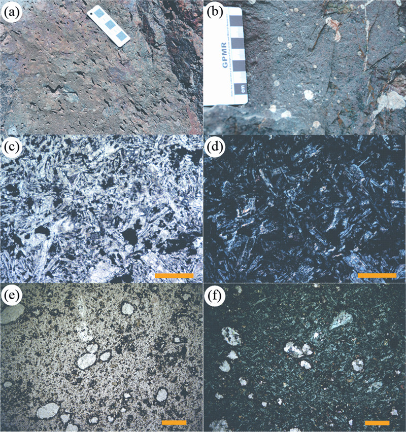图 3 长城系碱性岩野外和显微照片 (a、b)大红峪组火山岩野外照片,气孔杏仁构造,杏仁体被方解石、绿泥石充填;(c)大红峪组碱性玄武岩显微照片(-);(d)大红峪组碱性玄武岩显微照片(+);(e)侵入到串岭沟组的火山角砾岩显微照片(-);(f)侵入到串岭沟组的火山角砾岩显微照片(+).显微照片中黄色线段长500μm Fig. 3 Field photographs and Photomicrographs for alkali rocks in Changcheng system |