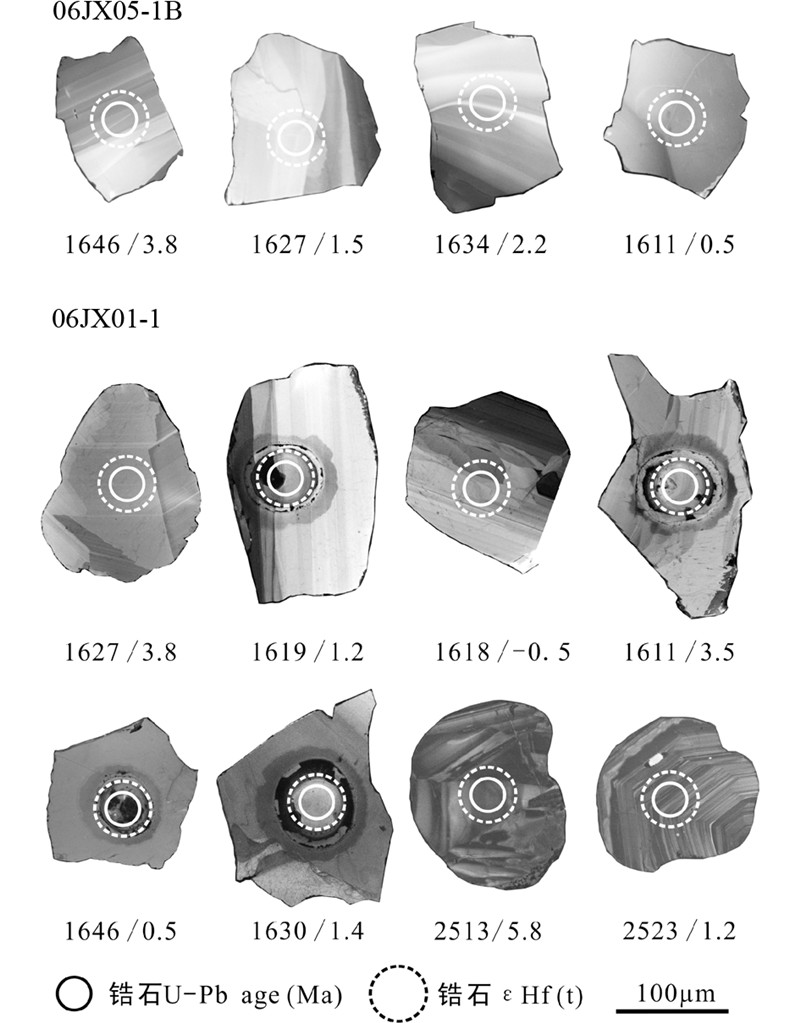 ![]() | 图 4 长城系大红峪组碱性玄武岩(06JX05-1B)和侵入到串岭沟组的火山角砾岩(06JX01-1)锆石CL图像 Fig. 4 CL image of zircons from alkali basalt(06JX05-1B)of the Dahongyu Formation and alkali subvolcanic rock intruding the Chuanlinggou Formation(06JX01-1)in the Changchengian System |