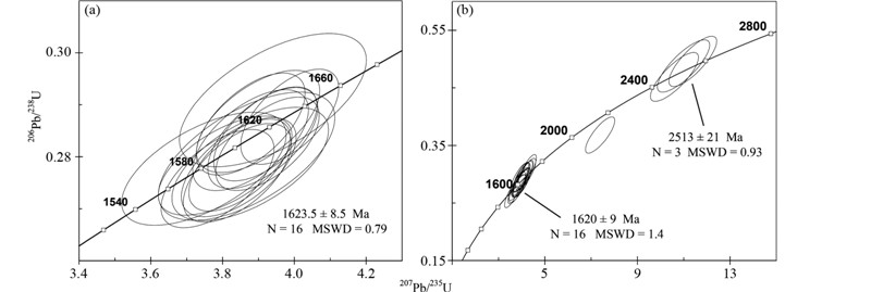 06JX05-1B锆石粒度50~200μm,他形不规则状外形,阴极发光图像无明显的环带,显示不规则状分区,具有碱性岩锆石的特点(图 4)。U含量变化范围47×10-6~514×10-6(表 1),Th/U为0.31~0.78均落入岩浆锆石范围(吴元保和郑永飞,2004)。全部测点(n=16)U-Pb年龄的谐和度都大于96%,207Pb/206Pb加权平均年龄为1624±9Ma(MSWD=0.79)(图 5a),该年龄代表大红峪组火山岩的结晶年龄,再一次验证了陆松年和李惠民(1991)报道的单颗粒锆石TIMS U-Pb年龄。