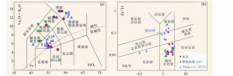 ![]() | 图 6 长城系碱性岩TAS(a,据Le Bas et al., 1986; Middlemost,1994)和Nb/Y-Zr/Ti(b,据Pearce,2014)图解S1-粗面玄武岩;S2-玄武质粗面安山岩;Pc-苦橄玄武岩 Fig. 6 TAS(a,after Le Bas et al., 1986; Middlemost,1994) and Nb/Y-Zr/Ti(b,after Pearce,2014)discrimination diagrams for alklai rocks in Changchengian System |