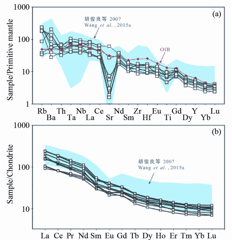 ![]() | 图 7 长城系碱性岩微量元素(a)和REE(b)图谱 Fig. 7 primitive mantle-normalized spider diagrams(a) and chondrite-normalized REE patterns(b)for alkali rocks in Changchengian System |