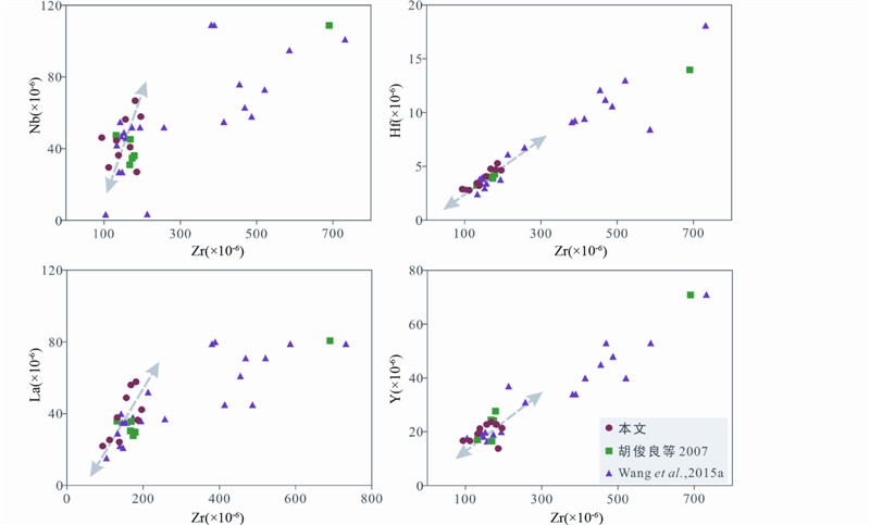 ![]() | 图 9 蚀变过程中微量元素活性的评估图 Fig. 9 Bivariate plots of Nb,La,Hf and Y vs. Zr to evaluate the mobility of these elements during alteration |