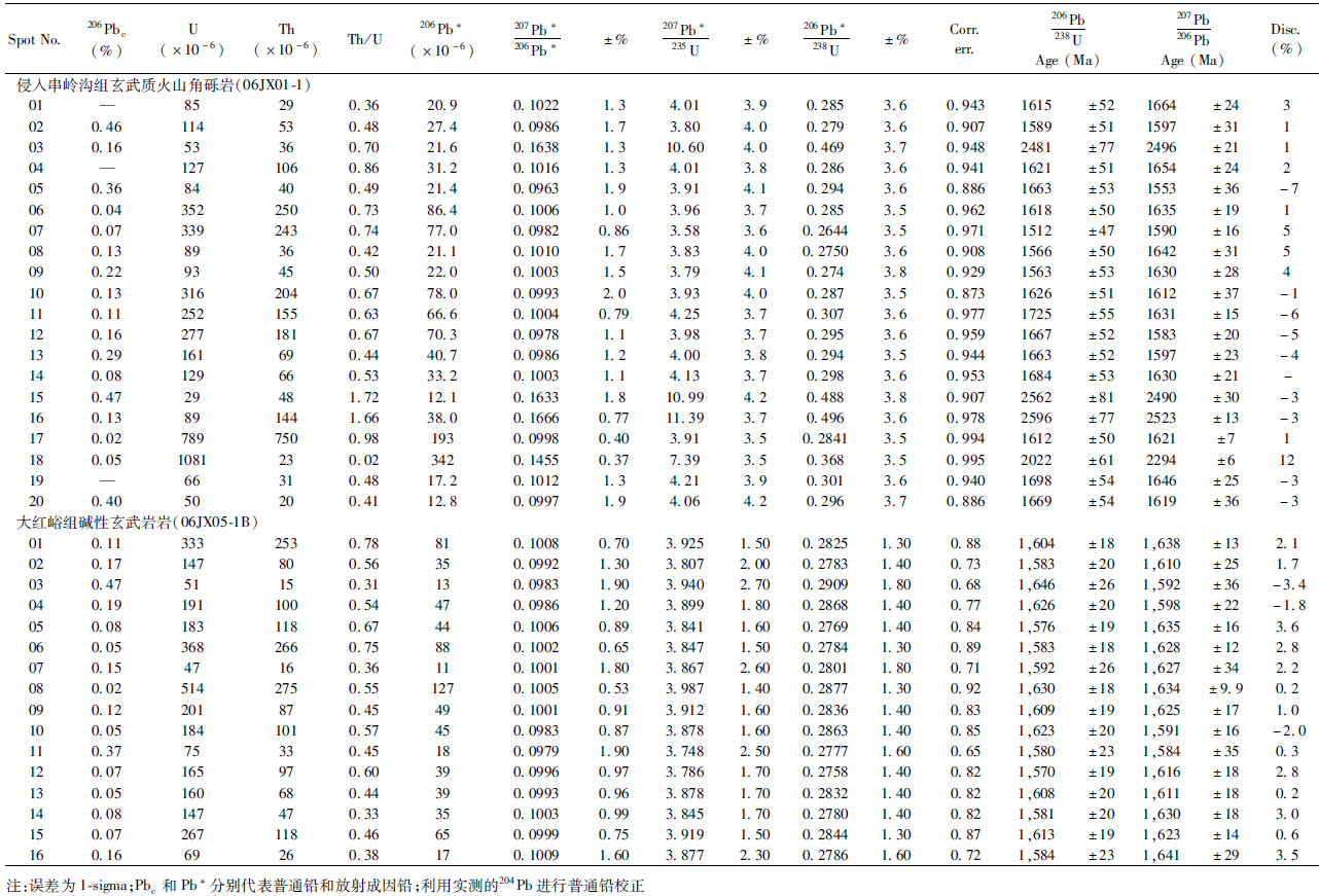 3 分析结果 3.1 锆石U-Pb年龄本文对燕辽裂陷槽中部长城系大红峪组碱性玄武岩(06JX05-1B)和侵入到串岭沟组的基性岩脉(06JX01-1)进行锆石U-Pb年代学分析,测试结果见表 1。