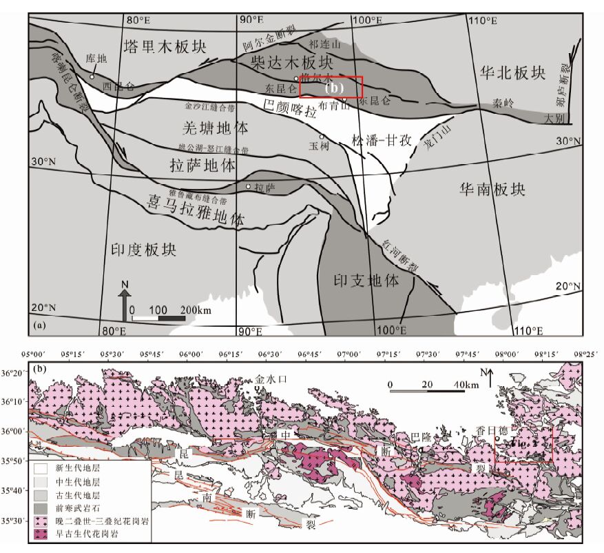 2 区域地质背景东昆仑造山带位于青藏高原北部,是青藏高原的重要组成单元(图 1),该造山带向东与秦岭造山带相连,向西则以阿尔金断裂与西昆仑相隔,北面与柴达木盆地相邻,南面则以昆南断裂与巴颜喀拉-松潘甘孜地体隔开(许志琴等, 2007,2013; Xu et al., 2015)。东昆仑造山带与秦岭和大别造山带构成了中国中央造山带,是划分中国南北地体的重要界限(殷鸿福和张克信,1998)。东昆仑造山带是典型的复合增生造山带(杨经绥等,2010),主要经历了早古生代原特提斯和晚古生代-早中生代古特提斯两期造山作用(Yang et al., 1996; Bian et al., 2004; 杨经绥等,2004),其中,古特提斯造山事件基本奠定了东昆仑现今的地质构造格局。以昆中原特提斯蛇绿混杂岩带(Meng et al., 2012)和昆南-阿尼玛卿古特提斯蛇绿混杂岩带(杨经绥等,2004)为界,可将东昆仑划分为昆北地体和昆南地体。