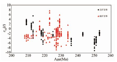 ![]() | 图 10 东昆仑古特提斯含矿与不含矿岩浆岩锆石Hf同位素组成 Fig. 10 Zircon Hf isotope of ore-bearing and barren granitoid rocks,Eastern Kunlun |