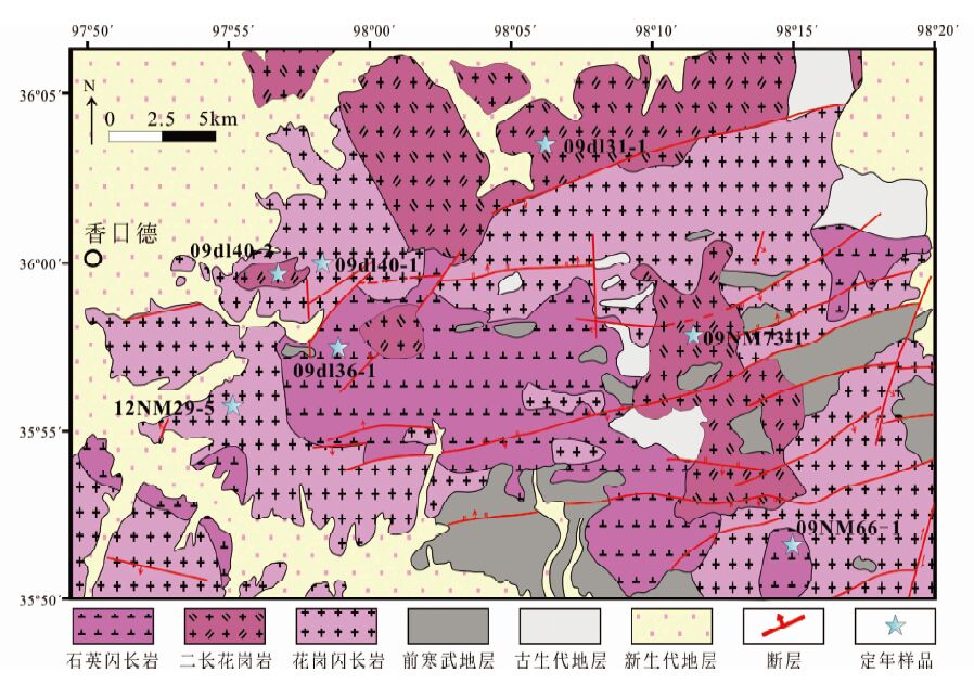 ![]() | 图 2 东昆仑东段香日德花岗岩基地质简图 Fig. 2 Geological sketch of Xiangride granitoid batholith in Eastern Kunlun Orogen |