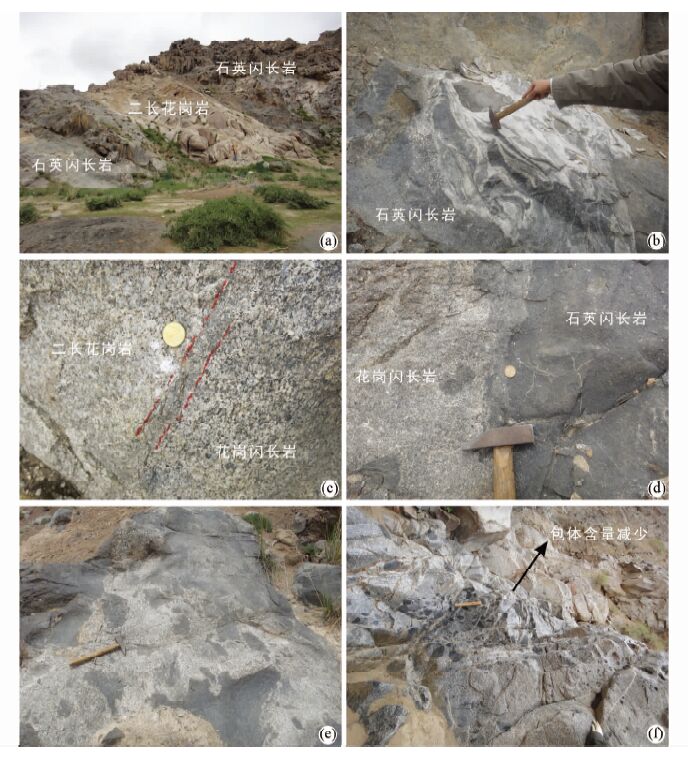 出露于香日德镇东南约2km的香日德复式岩基,是东昆仑造山带东端的一个代表性侵入体(图 1b),研究程度较高(如,罗明非等,2014)。该岩体处于昆中断裂带以北,构造位置属于昆北地体,出露面积超过1000km2。该岩基岩石类型复杂,具有多次侵入的特征,岩体侵入元古代小庙群及古生代地层。岩石类型包括石英闪长岩、二长花岗岩和(斑状)花岗闪长岩等(图 2)。野外地质研究发现,二长花岗岩呈脉状侵入石英闪长岩(图 3a),石英闪长岩具有强烈的岩浆混杂和混合现象(图 3b),局部可见花岗闪长岩呈网状分割石英闪长岩或捕获石英闪长岩团块(图 3d,e)。花岗闪长岩与二长花岗岩截然接触(图 3c),可见花岗闪长岩具有冷凝边,接触边界的矿物定向明显,矿物沿接触边界走向分布,以此可推知花岗闪长岩晚于二长花岗岩。综上分析,香日德复式岩基的岩浆侵位次序依次为石英闪长岩-二长花岗岩-(斑状)花岗闪长岩。此外,石英闪长岩和(斑状)花岗闪长岩内部可见大量闪长质暗色微粒包体,但在二长花岗岩中则少见或不见暗色微粒包体(图 3d-f)。