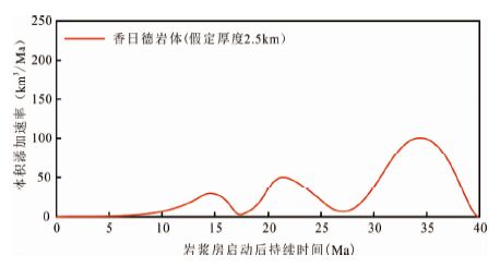 ![]() | 图 4 香日德岩基的岩浆体积添加速率随岩浆活动时间的变化图 Fig. 4 Variation of magmatic volume addition rate vs. Time of Xiangride granitoid batholith |