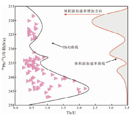 ![]() | 图 5 香日德岩基中锆石Th/U比值与岩浆体积添加速率对比图 Fig. 5 Zircon Th/U ratios and volume addition rate of of Xiangride granitoid batholith |