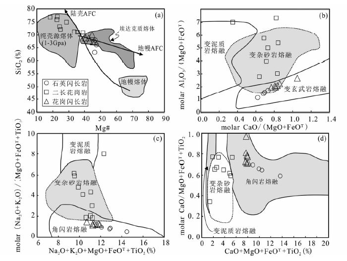 岩浆体积添加速率的初步估算表明,香日德岩基存在着三个旋回性发展的阶段。这种阶段性不仅与构造背景的转变密切相关,也与源区性质的变化紧密联系。实验岩石学对大陆下地壳不同源岩的大量熔融实验研究表明,来自变基性岩熔融的岩浆比来自变沉积岩熔融的岩浆具有更低的(Na2O+K2O)/(FeOT+MgO+TiO2)、CaO/(FeOT+MgO+TiO2)和Al2O3/(FeOT+MgO)比值,更高的CaO/(MgO+FeOT)和CaO+FeOT+MgO+TiO2比值(Patiño Douce and Johnston, 1991; Rapp et al., 1991; Rapp and Watson, 1995)。香日德岩基第一阶段岩浆岩具有与变基性岩部分熔融产生的岩浆相似的特征(图 8),指示岩浆可能来源于基性下地壳的部分熔融。然而,岩体内还发育镁铁质暗色微粒包体,可以认为,第一阶段石英闪长岩既与基性下地壳熔融有关,也存在幔源玄武质岩浆的叠加和混合作用。