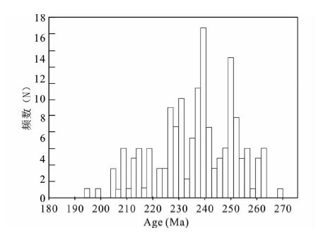 ![]() | 图 9 东昆仑古特提斯域花岗岩类的锆石U-Pb年龄统计图 Fig. 9 Zircon U-Pb age charts of Paleo-Tethyan granitoid rocks in Eastern Kunlun |