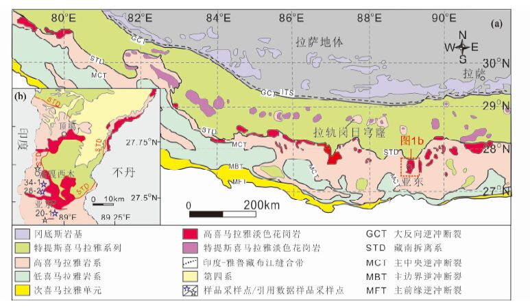 ![]() | 图 1 青藏高原南部地质简图(a,据Guo and Wilson, 2012)和亚东地质简图(b) Fig. 1 Simplified geological map of the southern Tibetan Plateau(a,after Guo and Wilson, 2012) and geological map of the Yadong area(b) |