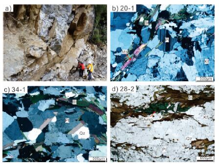 ![]() | 图 2 早古生代花岗质片麻岩野外照片及显微照片 Fig. 2 Photomicrographs of outcrops and photomicrographs of the Early Paleozoic granitic gneisses in Yadong area |
