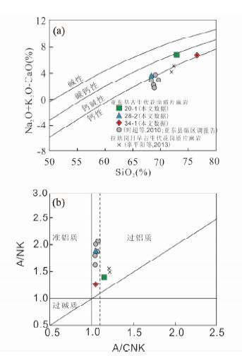 ![]() | 图 3 花岗质片麻岩Na2O+K2O-CaO与SiO2图解(a,据Frost et al., 2001)和A/NK-A/CNK图解(b,据Maniar and Piccoli, 1989) Fig. 3(Na2O+K2O-CaO)vs. SiO2 plot(a,after Frost et al., 2001) and A/NK vs. A/CNK diagram(b,after Maniar and Piccoli, 1989)of the granitic gneisses |