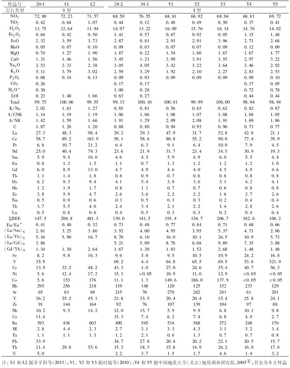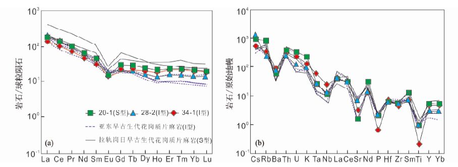 表 1 早古生代花岗质片麻岩的主量元素(wt%)和微量元素(×10-6)分析结果 Table 1 Major(wt%) and trace(×10-6)element composition of the Early Paleozoic granitic gneisses |