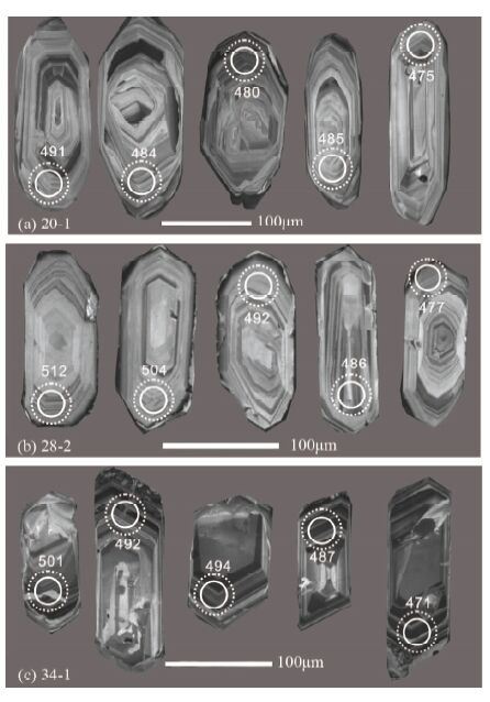 ![]() | 图 5 典型锆石阴极发光图像 实线圆圈为U-Pb年龄分析点,虚线圆圈为Hf同位素分析点 Fig. 5 Cathodoluminescence images of zircons The actual line circles and dotted line circles indicate the locations of U-Pb dating and Hf isotopic analyses,respectively |