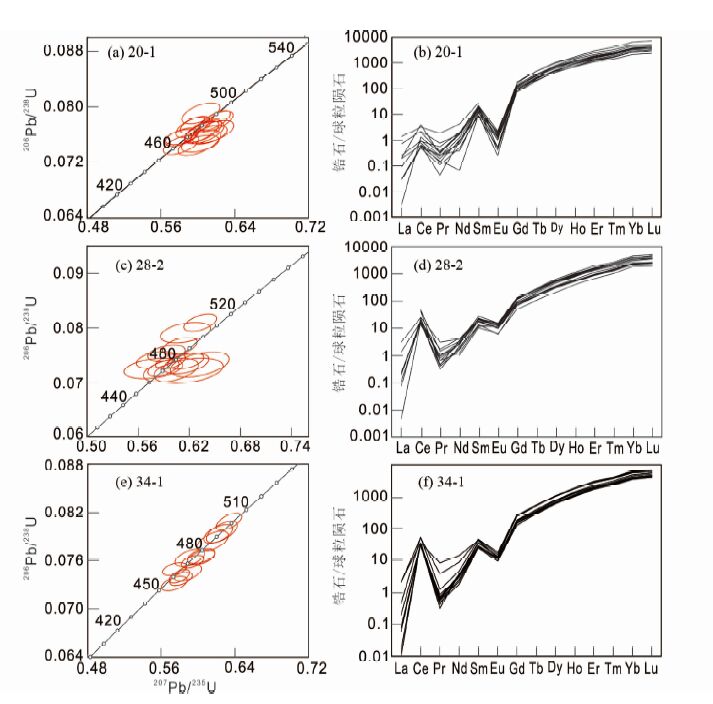 ![]() | 图 6 锆石U-Pb谐和曲线和稀土元素配分曲线(球粒陨石标准值据Taylor and McLennan, 1985) Fig. 6 U-Pb concordia diagrams and chondrite-normalized REE patterns of zircons(chondrite values after Taylor and McLennan, 1985) |