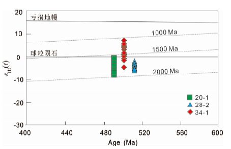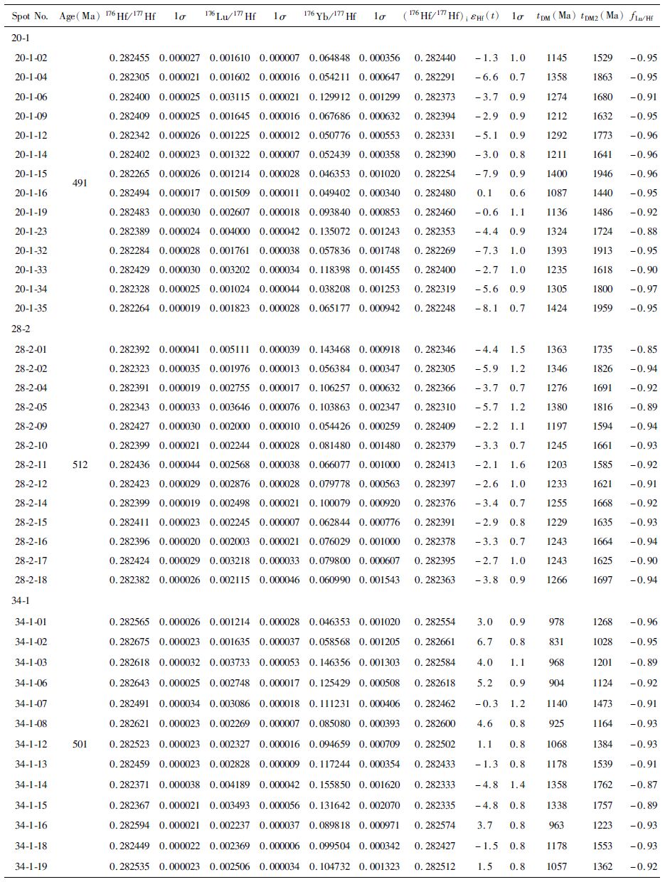 对3个样品中锆石的岩浆核进行了原位Hf同位素分析(表 4)。其中样品20-1的14个分析点获得的(176Hf/177Hf)i值为0.282248~0.282480,εHf(t)为-8.1~+0.1(图 7),相对应的Hf二阶段模式年龄(tDM2)为1440~1959Ma。样品28-2的13个分析点获得的(176Hf/177Hf)i值为0.282305~0.282413,εHf(t)为-5.9~-2.1(图 7),相对应的tDM2为1585~1826Ma。样品34-1的13个分析点获得的(176Hf/177Hf)i值为0.282333~0.282661,εHf(t)为-4.8~+6.7(图 7),对应的tDM2为1028~1762Ma(表 4)。