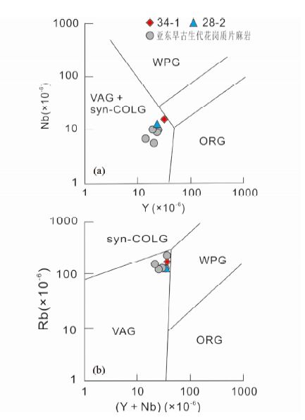 ![]() | 图 8 I型花岗质片麻岩构造环境判别图解(据Pearce et al., 1984) Fig. 8 Diagrams of the tectonic setting for Early Paleozoic I-type granitic gneisses(after Pearce et al., 1984) |
