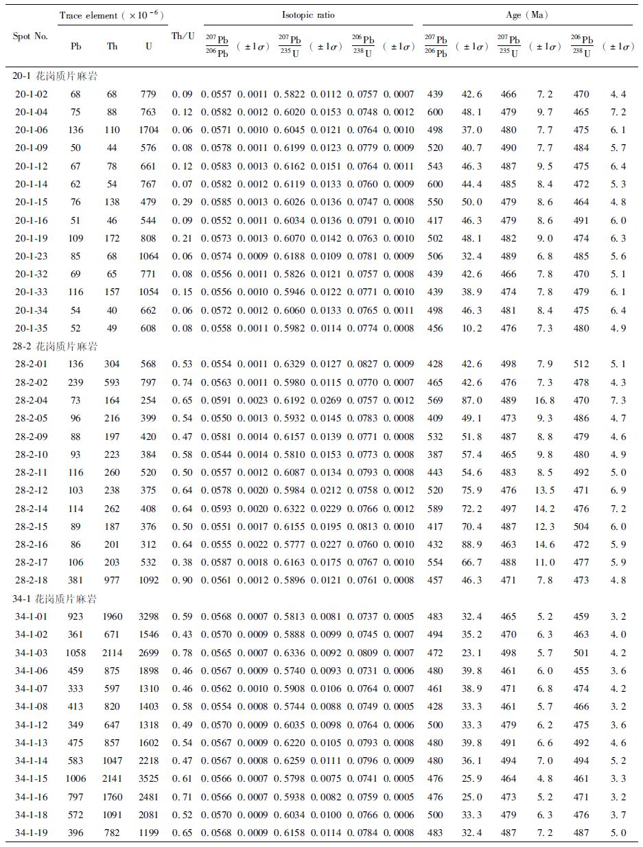 表 2 研究区花岗质片麻岩LA-ICPMS锆石U-Pb定年结果 Table 2 LA-ICPMS zircon U-Pb data of the Early Paleozoic granitic gneisses |