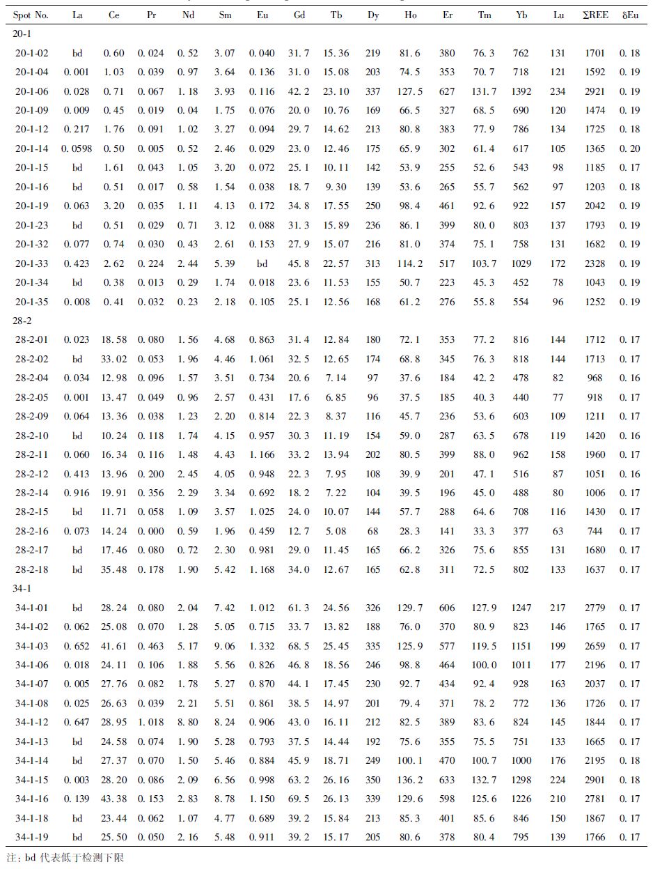 表 3 亚东地区早古生代花岗质片麻岩锆石稀土元素分析表(×10-6) Table 3 Zircon REE data of the Early Paleozoic granitic gneisses from the Yadong(×10-6) |