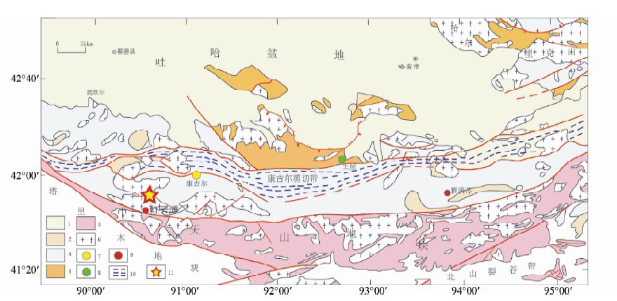 图 1 东天山构造格架地质简图(据王京彬等, 2006修改) 1-中新生代沉积盖层;2-二叠纪陆相火山-沉积岩系;3-石炭纪火山-沉积岩系;4-奥陶-泥盆纪火山-沉积岩系;5-变质岩;6-花岗岩类;7-金矿床;8-铜矿床;9-铁矿床;10-剪切带;11-采样位置 Fig. 1 Tectonic framework and geological sketch map of eastern Tianshan (modified after Wang et al, 2006) 1-MesoCenozoic sedimentary cover; 2-Permian continental volcanic-sedimentary rocks; 3-Carboniferous volcanic-sedimentary rocks; 4-Ordovician-Devonian volcanic-sedimentary rocks; 5-metamorphic rocks; 6-granitoids; 7-Au deposit; 8-Cu deposit; 9-Fe deposit; 10-shear zone; 11-sampling location |