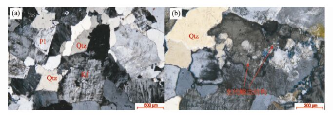 图 2 红云滩岩体花岗闪长岩显微照片 Pl-斜长石;Kf-钾长石;Qtz-石英 Fig. 2 Microphotographs of the Hongyuntan granodiorite Pl-plagioclase; Kf-K-feldspar; Qtz-uartz |
