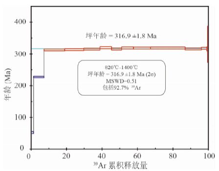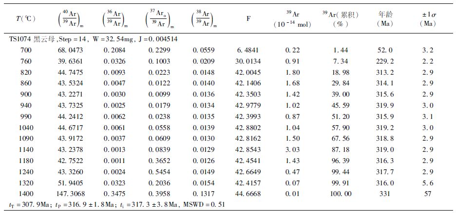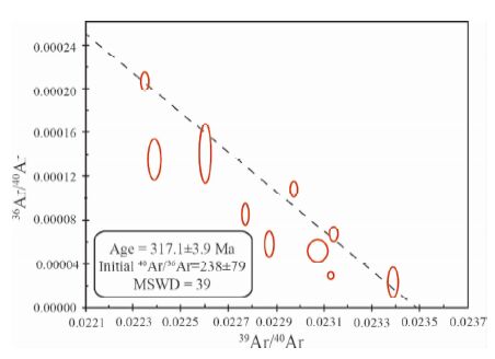 计算得到样品总气体年龄为307.9Ma。从图 3中可以看出,820~1400℃总共12个温度阶段组成了一个很好的年龄谱,坪年龄(tP)=316.9±1.8Ma,对应了92.7%的39Ar释放量。相应的39Ar/40Ar-36Ar/40Ar反等时线年龄(ti)=317.1±3.9Ma,40Ar/36Ar初始比值=238±79(MSWD=39)(图 4)。坪年龄和反等时线年龄在误差范围内完全一致。316.9±1.8Ma的Ar-Ar坪年龄代表了黑云母冷却降温至Ar-Ar同位素体系封闭温度时的年龄。