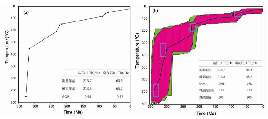 图 6 红云滩岩体热历史正演(a)与反演(b)模拟结果 Fig. 6 Forward modeling results (a) and inverse modeling results (b) for thermal history of Hongyuntan intrusive rocks |
