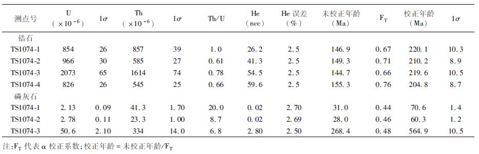 3.2(U-Th)/He年龄锆石和磷灰石单颗粒的(U-Th)/He同位素测年分析结果列于表 2。锆石显微照片见图 5a,晶体自形-半自形结构,粒度均在60μm以上,未见包裹体和裂缝,局部有蠕虫状蚀痕。4颗锆石的(U-Th)/He年龄在204.8±8.7Ma到220.1±10.3Ma之间,并在误差范围内完全一致,平均年龄为213.7±9.6Ma。4个锆石颗粒并未出现由于辐射损伤或存在包裹体、裂隙等因素导致的年龄分散现象,说明样品质量较好,所记录的热演化信息准确性较高。磷灰石显微照片见图 5b,晶体自形-半自形结构,但整体粒度较小,TS1074-1和TS1074-2透明度较好,TS1074-3透明度稍差。3颗磷灰石(U-Th)/He年龄分别为70.6±1.4Ma、60.3±1.2Ma、564.9±10.5Ma。数据显示,TS1074-3颗粒的(U-Th)/He年龄明显偏老,颗粒尺寸与另外2颗基本一致,但He含量高出两个数量级。该颗粒晶体为六方柱形态,并呈现一定程度的磨蚀,说明该颗粒是磷灰石,可排除疑似锆石造成的混淆。He含量异常高的原因可能是单矿物颗粒内部存在富含U、Th元素的包裹体,这些包裹体通常为锆石或独居石等晶体,在地质演化过程中释放了大量的He,并在加热取气过程中释放出来,但在磷灰石样品溶解过程中这些晶体无法溶于硝酸,U、Th元素不能进入到溶液中,从而导致子体元素偏高,使磷灰石(U-Th)/He年龄偏老。磷灰石样品TS1074-1和TS1074-2二者年龄较为接近,取其平均年龄65.5±1.3Ma进行计算和模拟。