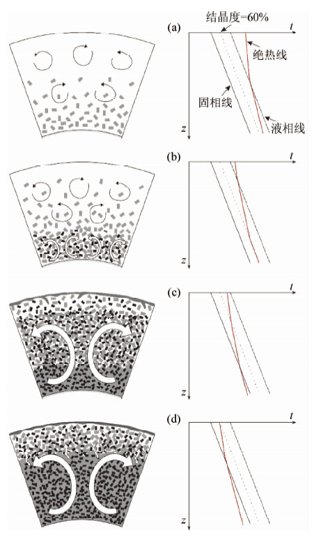 1.3 月壳形成主导模型目前,该领域的主导模型是岩浆洋演化岩石学与流体力学模型,其建立在流体力学、热力学、岩石学和地球化学数据的基础上(Solomatov,2007)(图 1)。图 1示意性给出岩浆洋演化的整个过程:当岩浆洋底部温度低于岩浆液相线时,发生部分结晶,此时岩浆洋的温度梯度是绝热的(图 1a);随着岩浆洋底部进一步冷却,当底部结晶度达到一定程度(结晶度=60%时,岩浆体系的行为更接近固体的行为),此时岩浆洋底部的对流类型已经发生变化。岩浆洋底部对流是重力不稳定性造成的,称为瑞利-泰勒不稳定性(Rayleigh-Taylor instability)。原因是岩浆洋底部的温度梯度与固相线梯度大致相同,大于绝热温度梯度(对于对流体系来说,绝热分布的流体是相对稳定的)(图 1b);当岩浆洋底部温度低于固相线时,对流变成固体对流(图 1c);当整个岩浆洋的结晶度>60%时,岩浆洋的冷却速度和结晶完全由固体对流和熔体渗透控制(图 1d)。