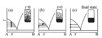二元封闭系统A-B的热迁移相图(据Lesher and Walker, 1988) 初始成分为X的物质组成放置在惰性金属囊中,置于温度梯度下(固相线-液相线之间).图a所示,系统在温度梯度下很快达到局部平衡,即晶体和局部熔体组分平衡,A相是液相线唯一矿物,液相中A组分自上而下逐渐减少,B组分自上而下逐渐增加;图b展示的为中间状态,液相中A组分向低温端扩散,为了保持局部平衡,A固相将在低温端持续结晶,高温端液相中A组分的减少又导致固相A在高温端持续溶解.与此相对应,液相中B组分持续从低温端向高温端扩散。因此,固相A就从高温端“巧妙”的迁移到了低温端;图c表示热迁移已经结束.晶体A已经全部迁移到低温端,中间的部分结晶区全部被消除,整个系统分为上部液相区和下部固相区 Fig. 3 Phase diagram for thermal migration of binary closed system of A and B(after Lesher and Walker, 1988) |