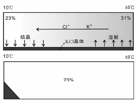 ![]() | 图 4 KCl溶液在温度梯度下的热迁移效应示意图 KCl溶液的溶解度与温度相关,因为容器底部存在KCl晶体,因此溶液处处达到KCl饱和.高温端比低温端KCl浓度大(一个大气压条件,10℃和60℃下KCl溶解度分别为23%和31%(孙志娟等, 2007)),浓度梯度导致溶液中K+和Cl-持续从高温端向低温端扩散(上图),低温端的过饱和导致结晶的发生,高温端的不饱和导致晶体的溶解,最终KCl晶体全部迁移堆积在低温端(下图) Fig. 4 Thermal migration of KCl solution under thermal gradient |