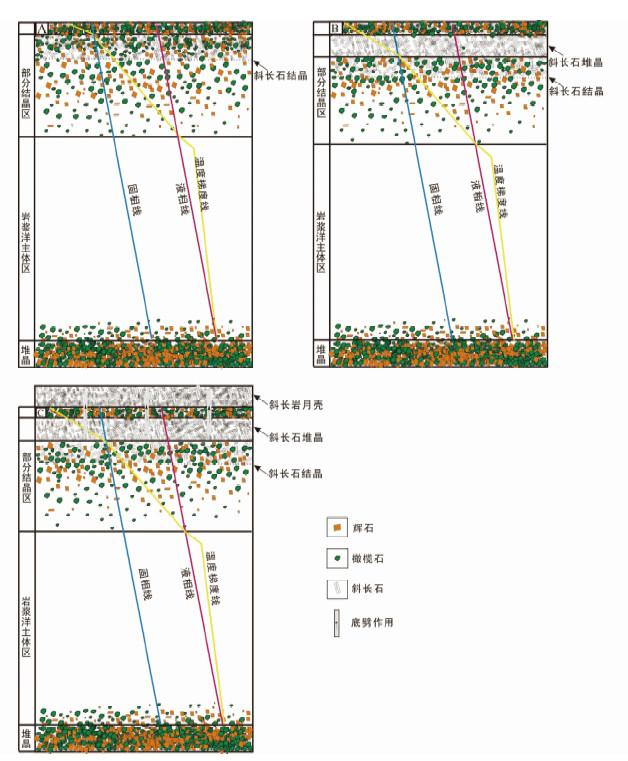 ![]() | 图 5 岩浆洋在传导盖层下的演化模型 (a)自上而下形成盖层,部分结晶区,岩浆洋主体区和堆晶区;(b)部分结晶区晶体密度不同,斜长石在顶部堆积,橄榄石和辉石持续下沉(下沉过程中不会溶解,直到下沉至岩浆洋主体区顶部发生熔融);部分结晶区的熔体部分在垂直方向发生成分分异,热迁移发生,结果将导致橄榄石,辉石,斜长石等在低温端持续结晶(类似KCl溶液低温端持续结晶KCl晶体),橄榄石和辉石持续下沉,斜长石持续上浮堆积;部分结晶区熔体部分叠加Soret效应,MgO、FeO、CaO等持续向低温端(上部)扩散,Na2O,SiO2持续向高温端(下部)扩散,导致不同温度层位液相线及液相线矿物成分改变;(c)持续堆积的斜长石由于密度小,在后期底劈上升“置换”初始的冷却盖层 Fig. 5 Evolution of magma ocean under conductive lid |