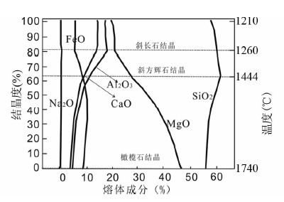 2)部分结晶区温度跨度从固相线温度渐变至液相线温度,自上至下结晶度从100%渐变为0。结晶度大于80%的区域,斜长石与辉石和橄榄石共同结晶,由于斜长石密度较岩浆洋密度小,可以上浮至盖层的底部堆积,辉石和橄榄石密度较岩浆洋密度更大,结晶之后会缓慢下沉至全部熔融区重新熔回岩浆洋。