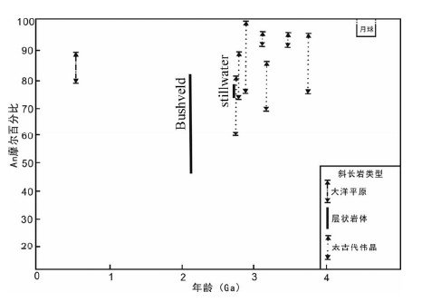![]() | 图 7 典型斜长石An牌号及年龄(据Lewis,2000; Ohtake et al., 2009) 右上角为月球斜长石An牌号范围 Fig. 7 An and ages of typical plagioclase(after Lewis,2000; Ohtake et al., 2009) |