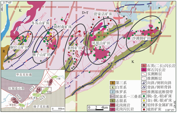![]() | 图 1 铜陵矿集区地质及矿床分布略图(据安徽省地矿局321地质队,1989①Fig. 1 Sketch map of geology and mineral deposit distribution of the Tongling ore district |
