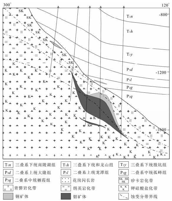 ![]() | 图 4 胡村南铜钼矿床94线剖面矿体及蚀变分带Fig. 4 Ore-bodies and alteration zoning of the 94 line profile of the South Hucun Cu-Mo deposit |