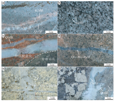 ![]() | 图 5 胡村南铜钼矿床热液蚀变特征照片(a)花岗闪长岩发育石英-钾长石脉;(b)黑云母化,黑云母呈细粒浸染状(星点状)交代花岗闪长岩;(c)钾硅酸盐化花岗闪长岩,叠加青磐岩化;(d)弥散状钾长石化、青磐岩化花岗闪长岩,辉钼矿零星分布于石英脉中;(e)黄铁绢英岩化花岗闪长岩,黄铜矿、黄铁矿分布于石英网脉中;(f)矽卡岩化花岗闪长岩,叠加绿泥石化.Qtz-石英;Kfs-钾长石;Bi-黑云母;Py-黄铁矿;Mo-辉钼矿;Cp-黄铜矿;Chl-绿泥石;Grt-石榴子石Fig. 5 Photos of the hydrothermal alteration types of the South Hucun Cu-Mo deposit(a)granodiorite grow quartz-K-feldspar vein;(b)biotitization,biotite replace granodiorite as star point;(c)K-silicatization granodiorite,superposed propylitization;(d)granodiorite grow diffusion-like potash feldspathization and propylitization,molybdenite distributed in quartz vein;(e)beresitization granodiorite,chalcopyrite and pyrite distributed in quartz veinlets;(f)skarnification granodiorite,superposed chloritization. Qtz-quartz; Kfs-K-feldspar; Bi-biotite; Py-pyrite; Mo-molybdenite; Cp-chalcopyrite; Chl-chlorite; Grt-garnet |