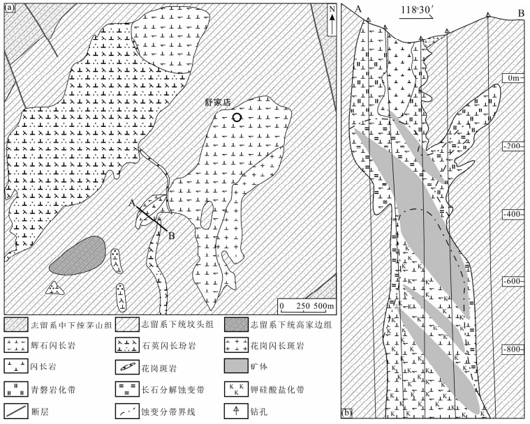 舒家店铜矿床是近年来发现的一个大型斑岩型矿床,现已探明铜资源量约0.7Mt。矿床位于铜陵-戴家汇东西向隐伏基底断裂带上,东北与繁昌火山岩盆地相邻(图 1)。矿区发育NE和NNW向两组断裂构造,控制舒家店岩体的空间展布。志留系下统高家边组和坟头组为核部、泥盆系至三叠系为两翼的沉积地层构成舒家店短轴背斜。舒家店岩体侵位于舒家店短轴背斜近轴部,呈岩株状产出,面积约2km2(王彪,2010)。舒家店岩体为一杂岩体,由辉石闪长岩、花岗闪长(斑)岩、石英闪长玢岩、闪长岩等组成。辉石闪长岩构成杂岩体的主体,也是舒家店铜矿床的主要赋矿岩石,出露于杂岩体的中部和北部,岩石具中-细粒不等粒结构。花岗闪长(斑)岩出露于东南部,中心相具中粗粒结构,边缘相具斑状结构。石英闪长玢岩和闪长岩呈小岩株和岩脉出露于西南部,总体呈NNW向和NE向(图 6a)。依据地表露头和钻孔岩心观察到的接触关系,侵入岩的侵入顺序依次为花岗闪长(斑)岩→石英闪长玢岩→辉石闪长岩(王彪,2010)。辉石闪长岩黑云母Ar-Ar年龄为138.2±4.6Ma(吴才来等,1996),锆石SHRIMP U-Pb年龄为142.4±0.7Ma(吴才来等,2010),LA-ICP MS U-Pb年龄为139.2±2.1Ma(王世伟等,2011)、140.5±1.4Ma(赖小东等,2012),即辉石闪长岩的年龄介于138~142Ma之间。舒家店斑岩铜矿床辉钼矿Re-Os年龄为140.6±2.0Ma,黑云母Ar-Ar坪年龄为142.8±1.1Ma(王世伟等,2012)。因此,赋矿辉石闪长岩的成岩年龄与矿床成矿年龄在误差范围内基本一致,反映成矿作用与赋矿辉石闪长岩的岩浆作用及其相关热液作用密切相关。矿区地表出露地层主要为坟头组砂质页岩、砂岩、粉砂岩及泥质粉砂岩,西北部和东北部零星出露泥盆系、石炭系、二叠系和三叠系地层,中部和西部山谷多为第四系覆盖。