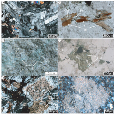 ![]() | 图 7 舒家店铜矿床典型蚀变岩石照片(a)钾长石化,钾长石交代斜长石,沿斜长石边缘次生加大(正交偏光);(b)黑云母化、绿泥石化,黑云母交代辉石,绿泥石交代黑云母(单偏光);(c)青磐岩化辉石闪长岩,黄铁矿呈星点状分布于其中;(d)绿泥石化,绿泥石沿角闪石解理或边部发生交代作用(单偏光);(e)长石发生强烈的粘土化(正交偏光);(f)长石分解蚀变,长石颗粒全部被绢云母和粘土矿物交代(正交偏光).Pl-斜长石;Kfs-钾长石;Chl-绿泥石;Px-辉石;Bi-黑云母;Hbl-角闪石;Py-黄铁矿;Clay-粘土矿物;Ser-绢云母Fig. 7 Photos of the typical alteration rocks of the Shujiadian Cu deposit(a)potash feldspathization,K-feldspar replace plagioclase(CPL);(b)biotitization and chloritization,biotite replace pyroxene and then replaced by chlorite(PPL);(c)propylitization pyroxene diorite,pyrite distributed as star point;(d)chloritization,chlorite replace hornblende(PPL);(e)feldspar grow strongly clayization(CPL);(f)feldspar-destructive alteration,the feldspar replaced by sericite and clay minerals(CPL). Pl-plagioclase; Kfs-K-feldspar; Chl-chlorite; Px-pyroxene; Bi-biotite; Hbl-hornblende; Py-pyrite; Clay-clay minerals; Ser-sericite |