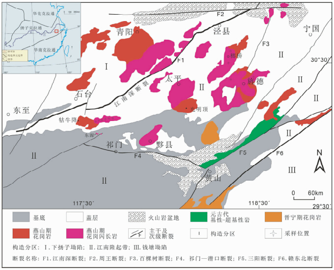 安徽南部有三个构造单元组成:下扬子凹陷、江南隆起带和钱塘凹陷(图 1)。地质构造演化较为复杂,先后经历了晋宁、加里东、海西、印支、燕山及喜马拉雅期构造运动,不同构造运动时期的沉积特征、岩浆活动、变质变形及成矿作用均各具特色,且后期构造对前期构造多有叠加改造,形成了现今的构造格局(图 1)。其中中生代构造运动表现尤为强烈。