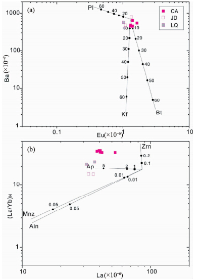 ![]() | 图 10 log(Ba)-log(Eu)图解(a,据Philpotts and Schnetzler, 1970; Arth,1976)和log((La/Yb)N)-log(La)图解(b,据Fujimaki,1986; Mahood and Hildreth, 1983)Pl-斜长石;Kf-钾长石;Bt-黑云母;Aln-褐帘石;Mnz-独居石;Ap-磷灰石;Zrn-锆石Fig. 10 log(Ba)-log(Eu)diagram(a,after Philpotts and Schnetzler, 1970; Arth,1976) and log((La/Yb)N)-log(La)diagram(b,after Fujimaki,1986; Mahood and Hildreth, 1983)Pl-plagioclase; Kf-K-feldspar; Bt-biotite; Aln-allanite; Mnz-monazite; Ap-apatite; Zrn-zircon |