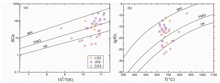 ![]() | 图 11 皖南花岗闪长岩锆石δCe-104/T图解(a)和T(℃)-lgfO2(b)图解(据Qiu et al., 2013)Fig. 11 δCe-104/T diagram(a) and T(℃)-lgfO2 diagram(b)of zircons from granodiorites in southern Anhui Province(after Qiu et al., 2013) |