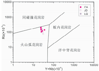 ![]() | 图 12 Rb-Y+Nb图解(据Pearce et al., 1984)Fig. 12 Rb-Y+Nb diagram(after Pearce et al., 1984) |